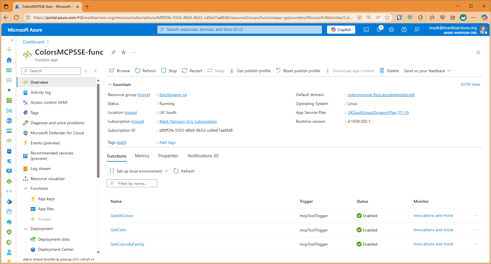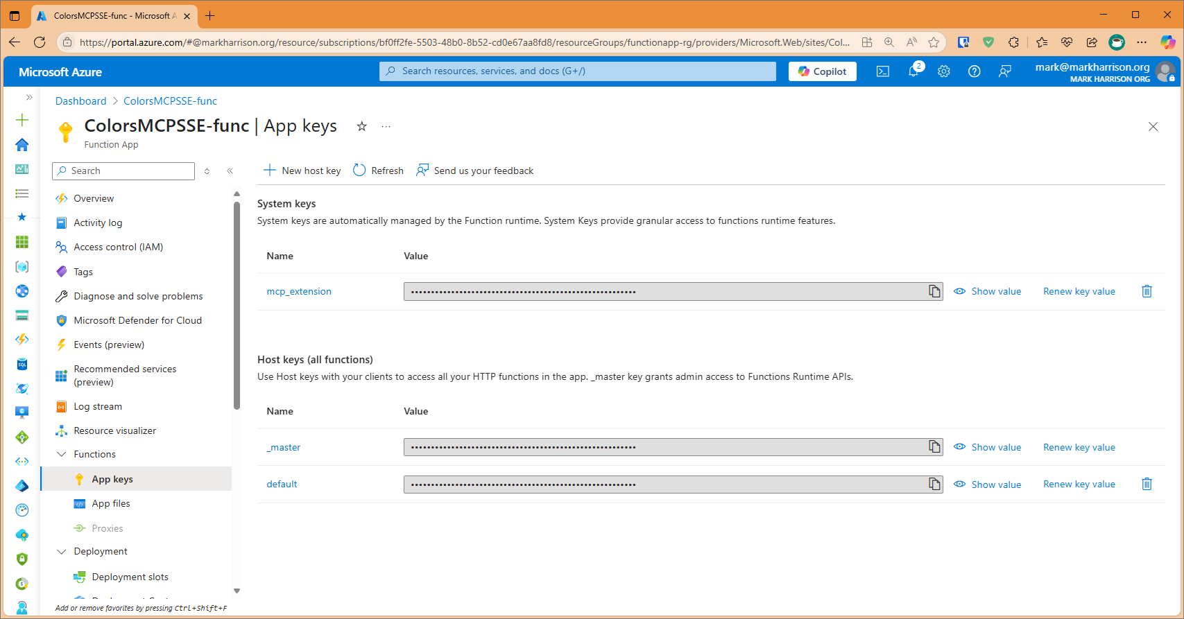 Note that the Url of the MCP Server will be http://xxxxx.azurewebsites.net/runtime/webhooks/mcp/sse.