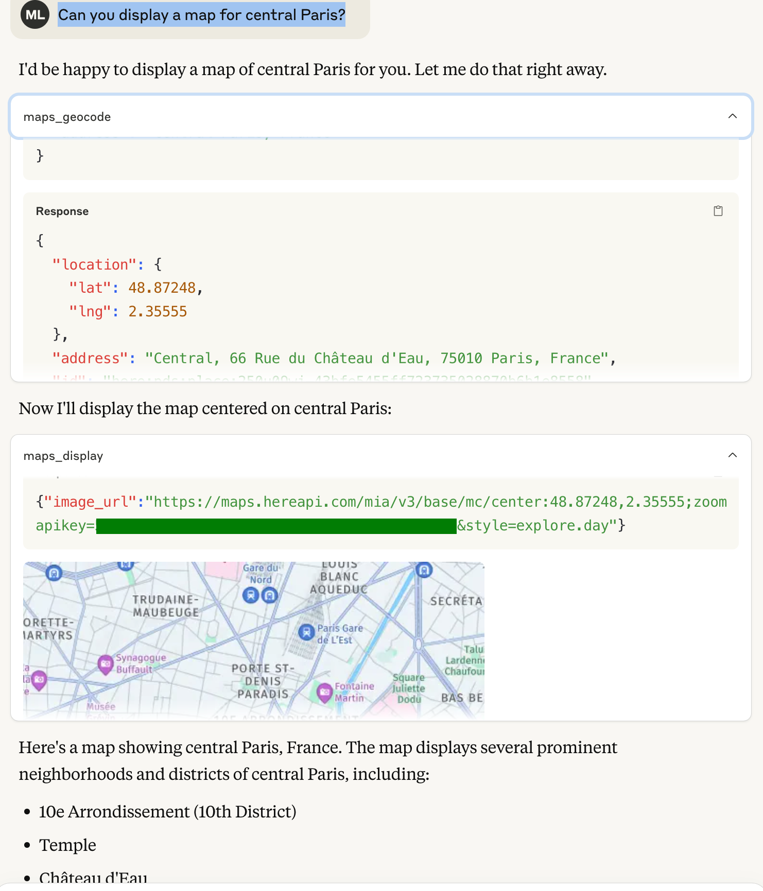 This should trigger geocode tool call to find out the geo coordinates of central Paris. Then the display tool call will be triggered.