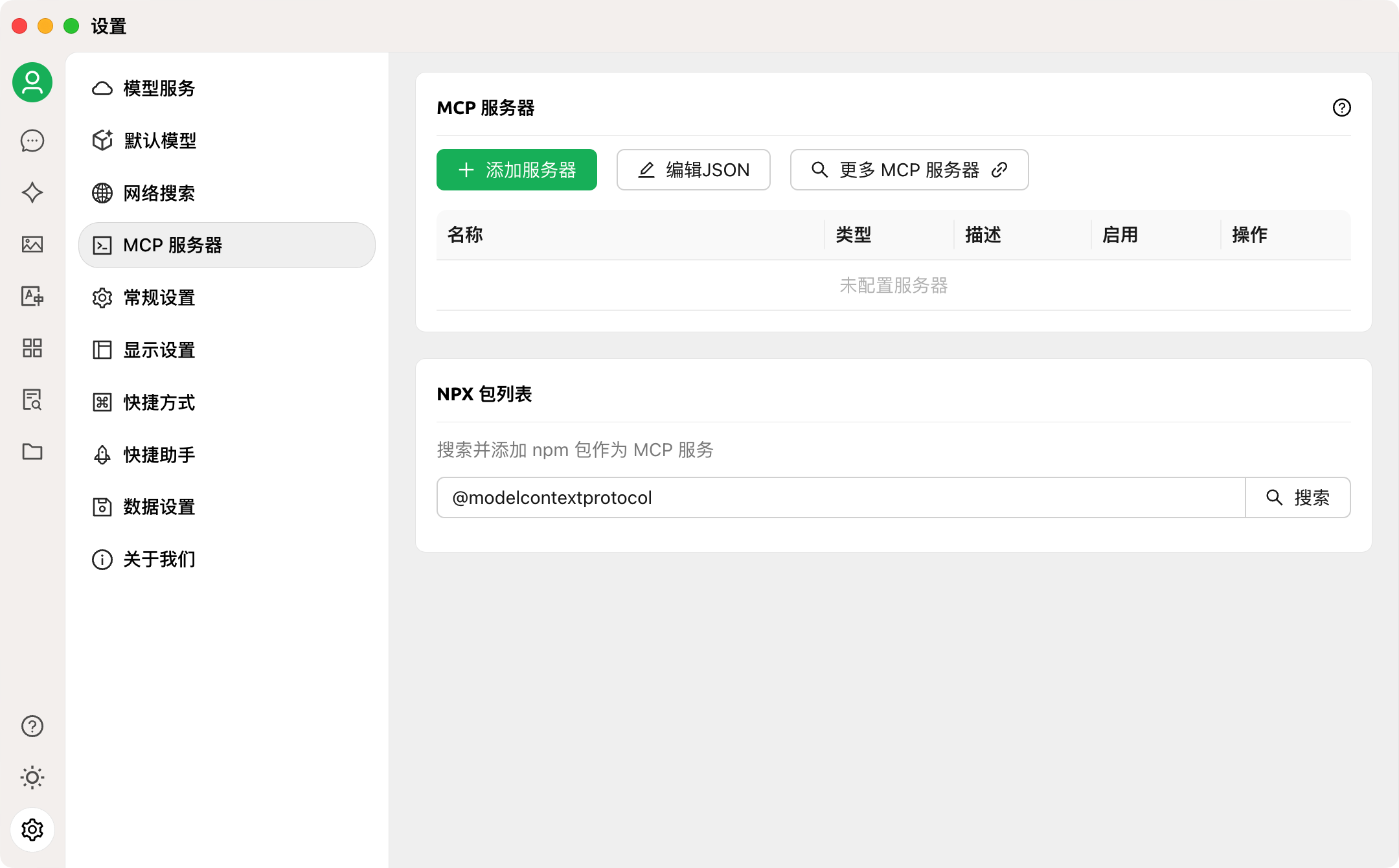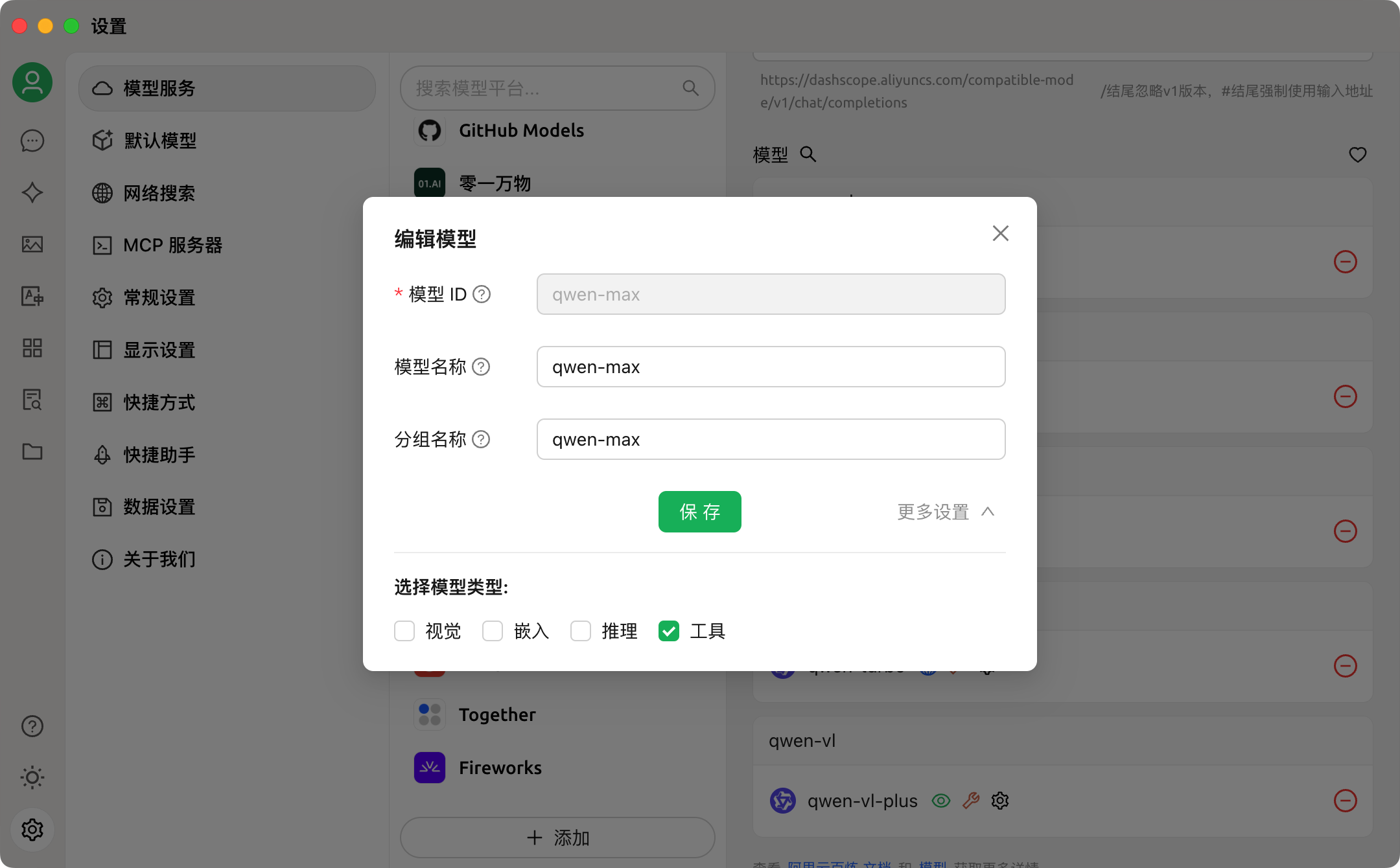 3) 在设置-模型服务里选择一个模型,输入API密钥,选择模型设置,勾选下工具函数调用功能。